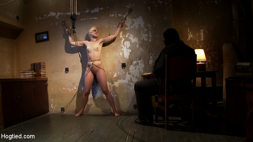 A hard tight bondage makes the babe immensely suffering from the pain and irritation the ropes provide. The master enhances the sensations fingering the pussy and squeezing the piss flaps making the babe cry